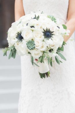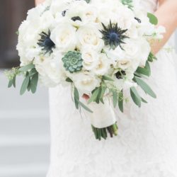 “We love working with thistle in bouquets because it gives a great added texture to the bouquet and a subtle blue tone for our brides in that color palette.”