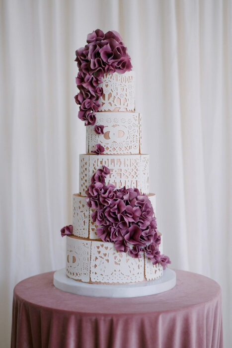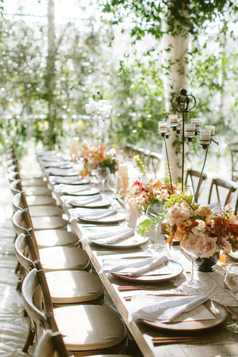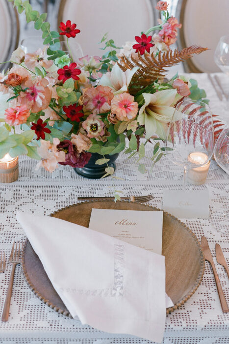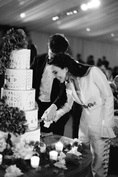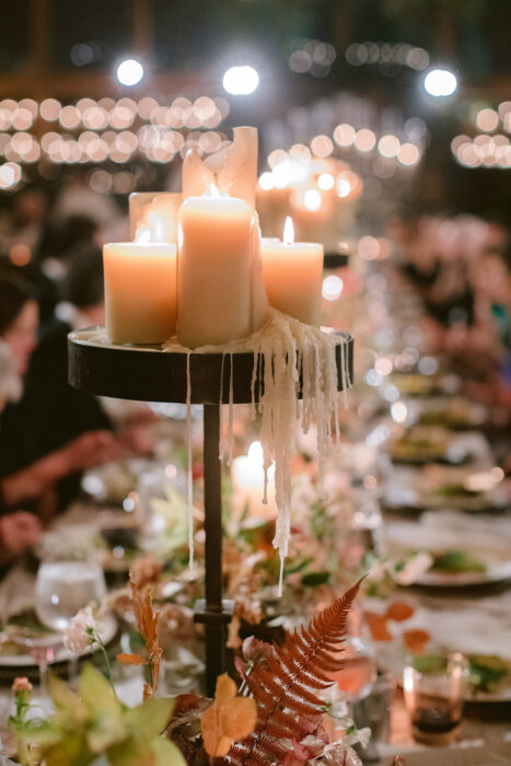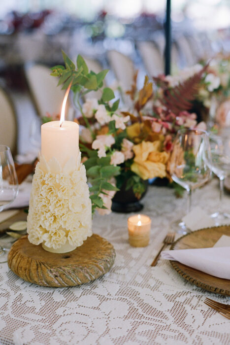 “They had a very clear vision,” says McKellar. “They wanted to reflect how they normally are.” To that end, hand-embroidered linens from Mrs. Lynch’s personal collection—many of which she’d bought with her daughter’s wedding in mind—topped tables, which were accented with Barboglio’s candelabras and handmade candles Cristina picked up in Oaxaca.