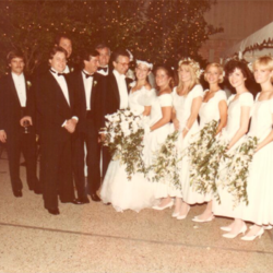Their approach was European, but the wedding was grand and magical in a way only a Dallas wedding could be. Michelle envisioned a “white wonderland,” which hadn’t yet been done at the time. “There were twinkle lights in all of the trees and thousands of orchids going down the creek bed,” she remembers. The flowers and décor were arranged by Kendall Bailey with help from Michelle’s friend and fellow interior designer, Stephen Sills. “My mother had planted white caladiums everywhere that year and Kendall sprinkled his fairy dust over them.” All of the bridesmaids wore white, too, with customized floral headpieces to match.