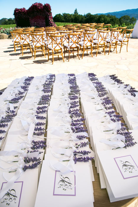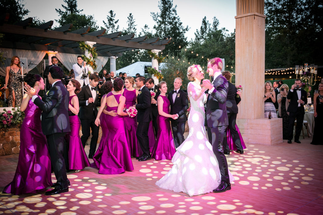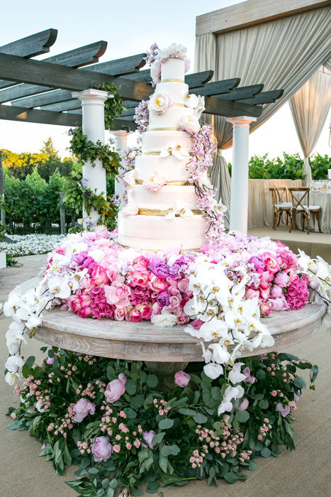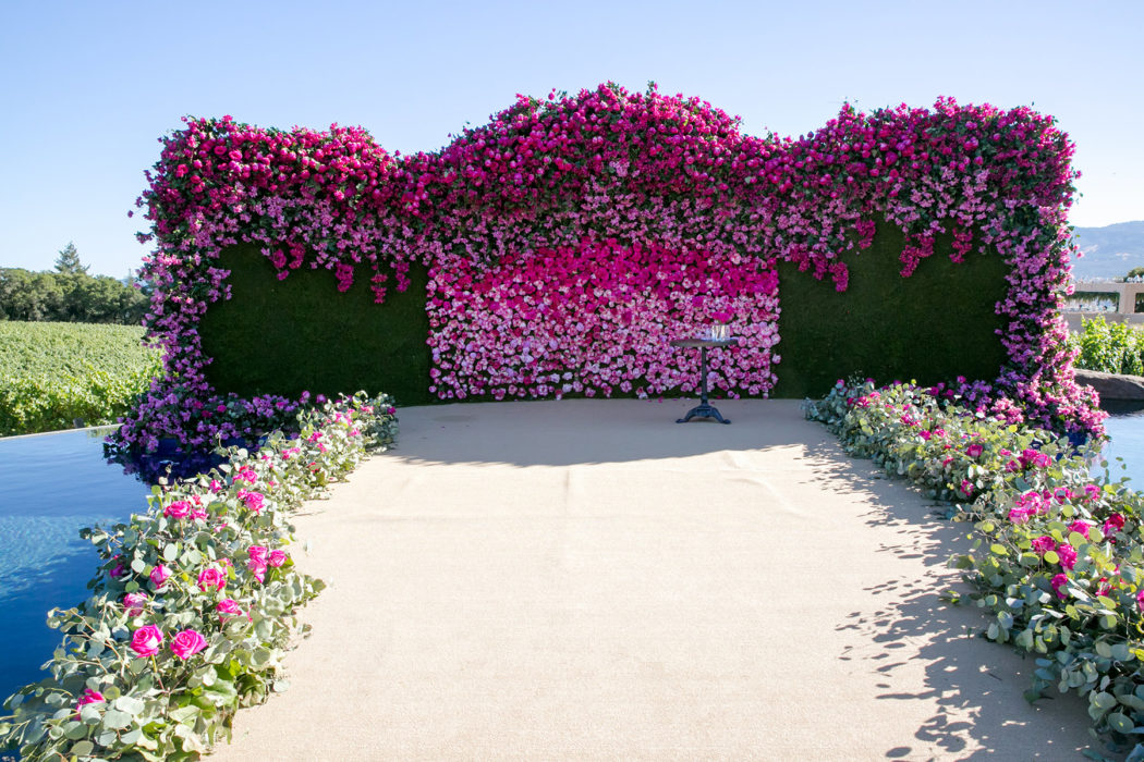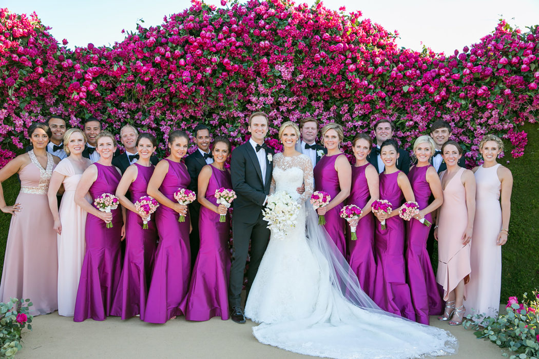 Backyard wedding, yes. Simple, no, especially when the backyard in question is the estate and winery of Craig and Kathryn Hall in Rutherford, California. A platform was constructed over the pool, and a flower wall—in fuchsia—created a festive focal point for the stunning Napa Valley view. The 330 guests sat in a semicircle around the couple, while the wedding party stood gathered together on one side.