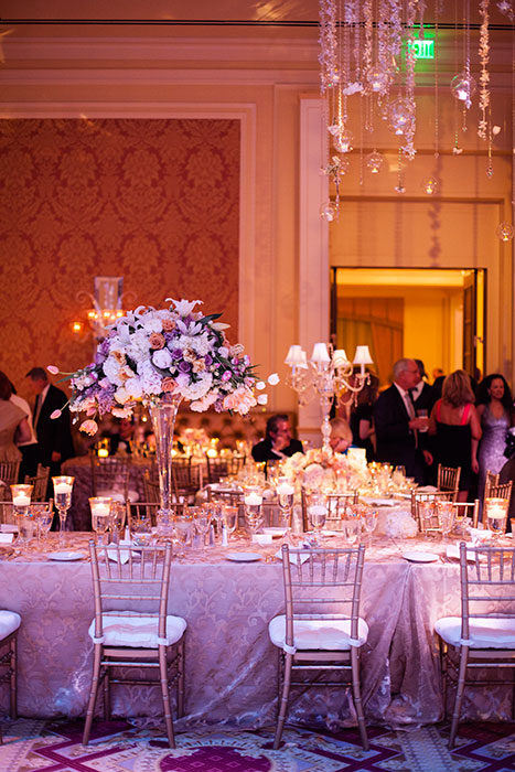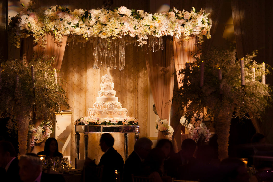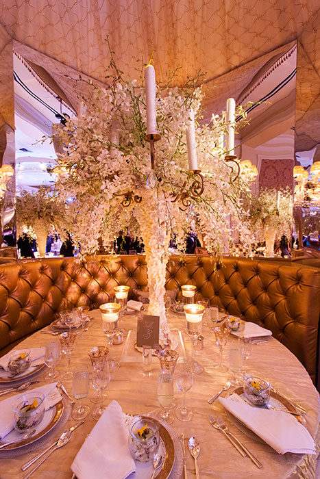 The wild and wonderful celebration with dinner and dancing also incorporated 60 types of flowers, approximately 2,000 feet of hanging crystal, a costume change for the bride, foot massages for the ladies, and a late-night snack of Fletcher’s corny dogs. It seemed that no festive stone was left unturned.