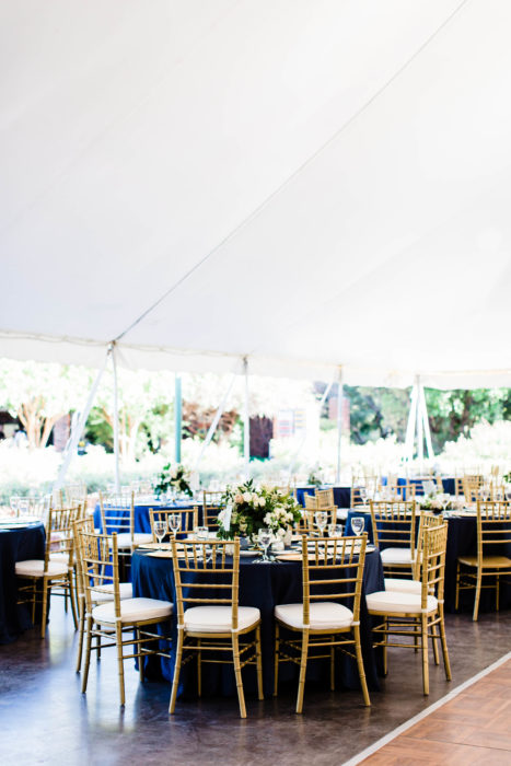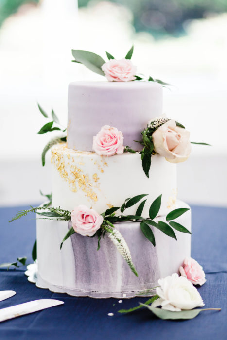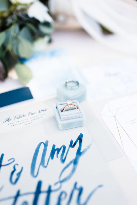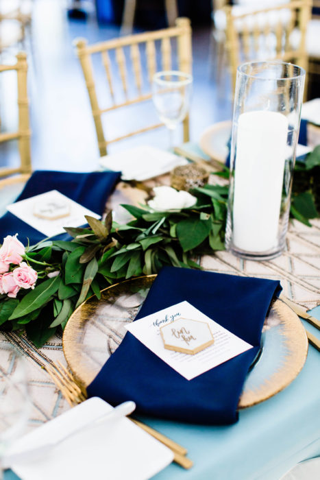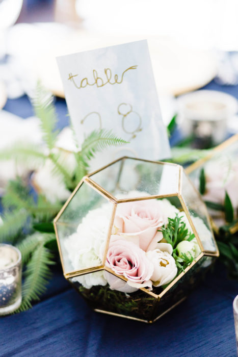Minimal gold and glass geo terrariums served as the footing for the décor. The couple incorporated them as centerpieces, pairing the metallic accent with a color palette of sea glass blue, navy, and hints of blush. “I wanted to ensure that everything we did was timeless and uniquely ‘us,’” says Sean. Sean loves marble, and incorporated that as an elemental texture in the invitations, the wedding cake, and name cards.
