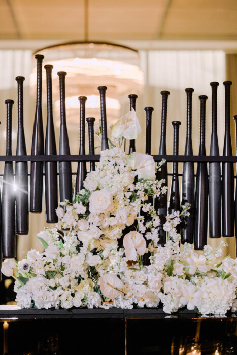 Leslie incorporated subtle nods to baseball—from seating assignments presented in the form of custom trading cards (created by Irving-based Panini America) to black bats used en masse as a decorative element. “Maggie didn’t want it to be the theme,” Leslie remembers. “So my goal was to bring in those elements without it being loud.”