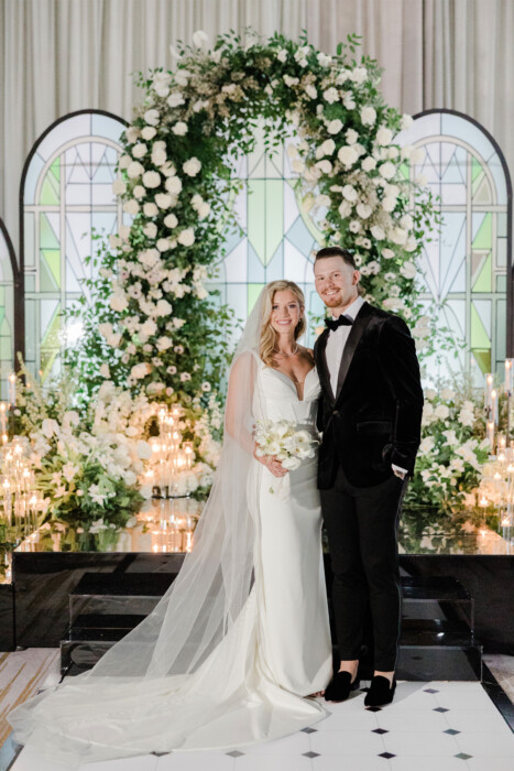 The high school sweethearts followed their mutual love of the game in different directions, dating long-distance until Bobby made his MLB debut with the Kansas City Royals in 2022. After getting engaged, the couple drafted Leslie Ochs of Alice and Apricot Weddings to plan a celebration that blended Maggie’s preference for a monochromatic color palette with plenty of nods to the sport that brought them together. Says Maggie, “It was the best day of my life.”