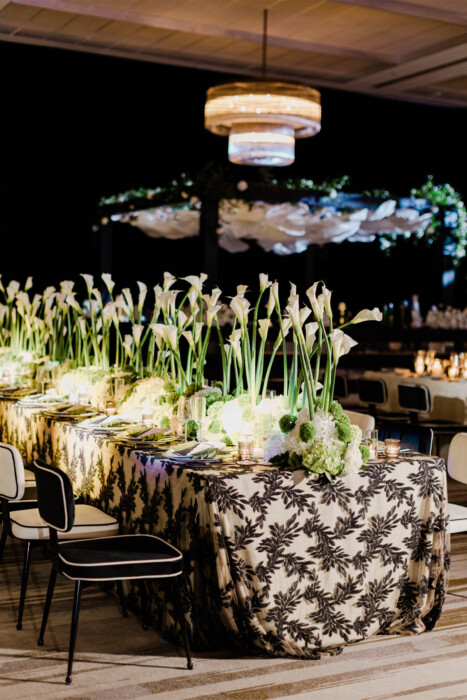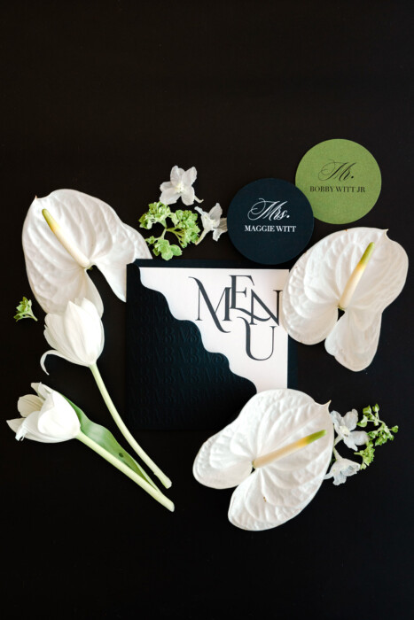 In how she dresses and decorates, Maggie prefers a “uniformed” look. She requested a black-and-white scheme, which—along with touches of green—Leslie incorporated into paper goods, table linens, and a custom dance floor.