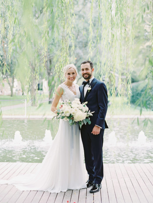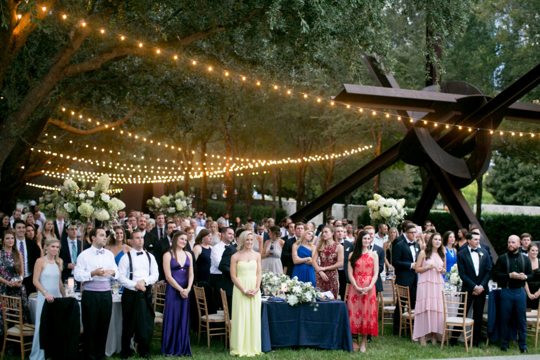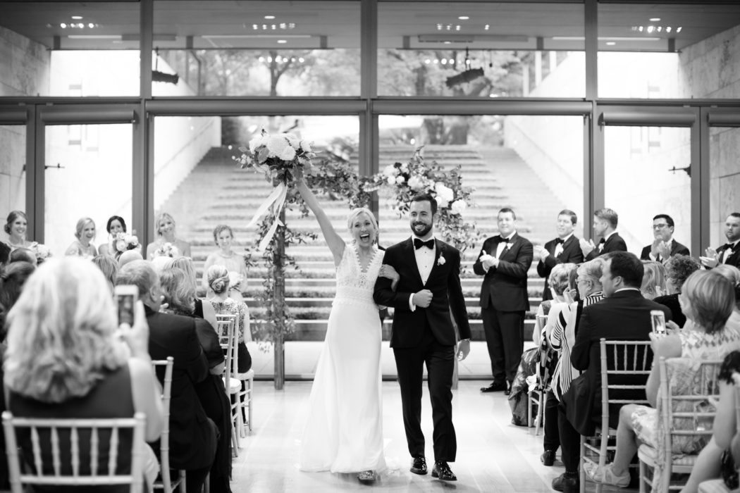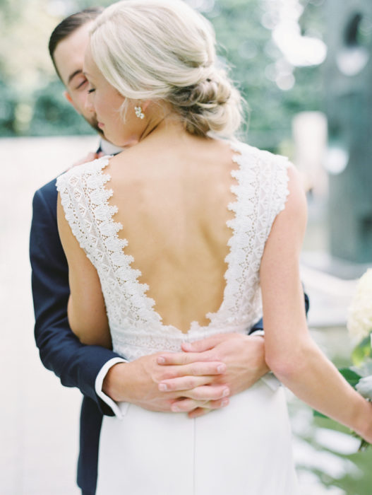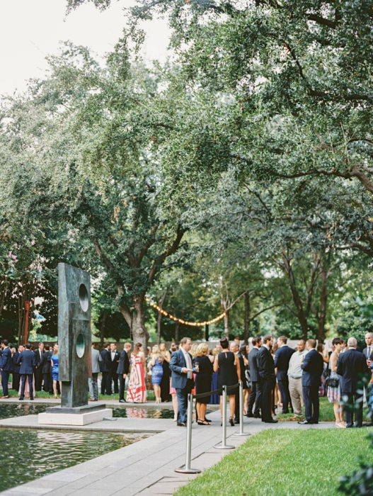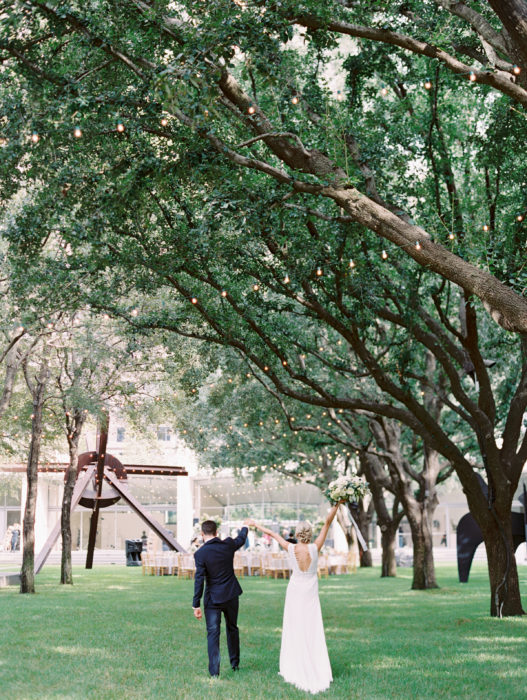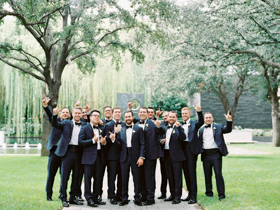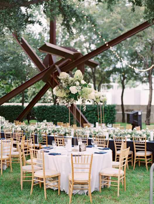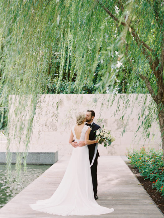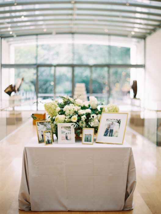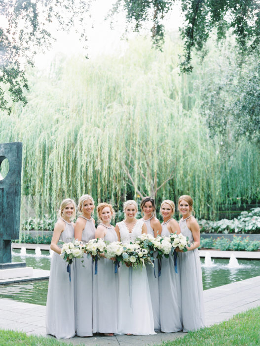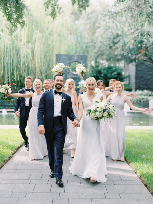 With dreams of having an outdoor wedding, the beautiful setting of the Nasher Sculpture Center was perfect for the couple. “I wanted the venue’s aesthetic to speak for itself, and I didn’t want to take away from its beauty,” Kari says. The vision for the venue was a timeless scheme with modern details. They kept the palette neutral with whites, grays, and elements of wood, metals, and marble. Groomsmen wore navy suits and bridesmaids wore light gray haltered gowns.