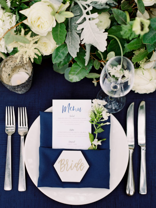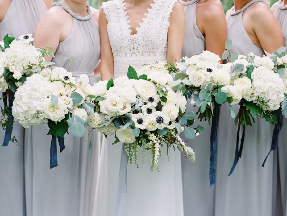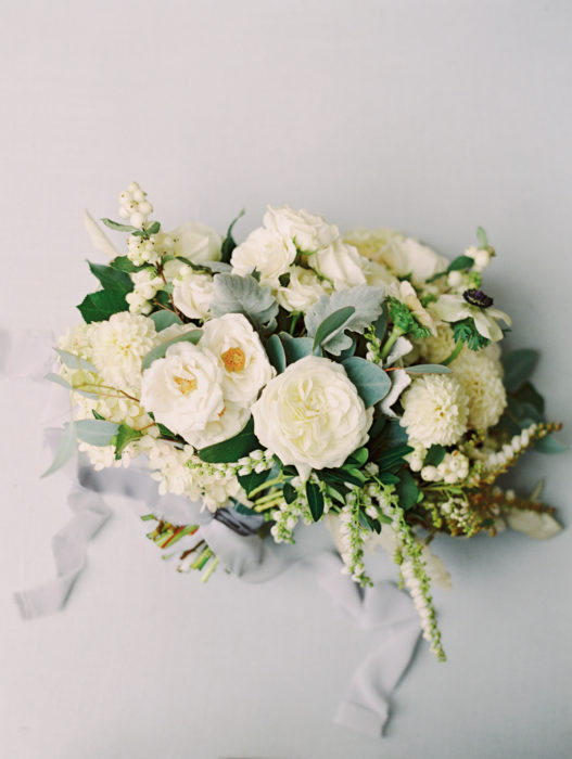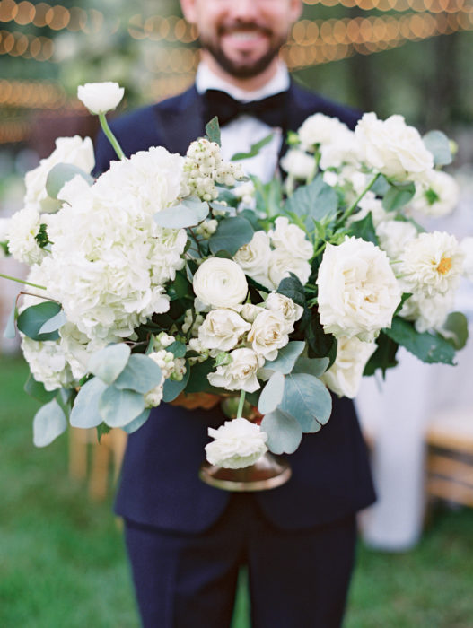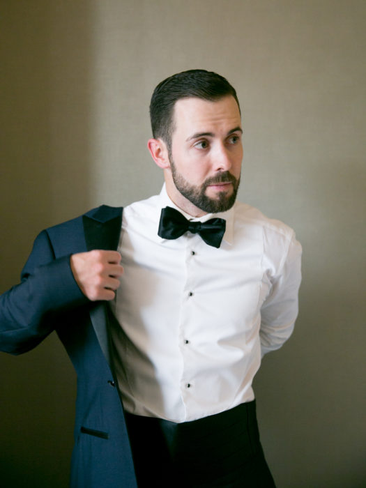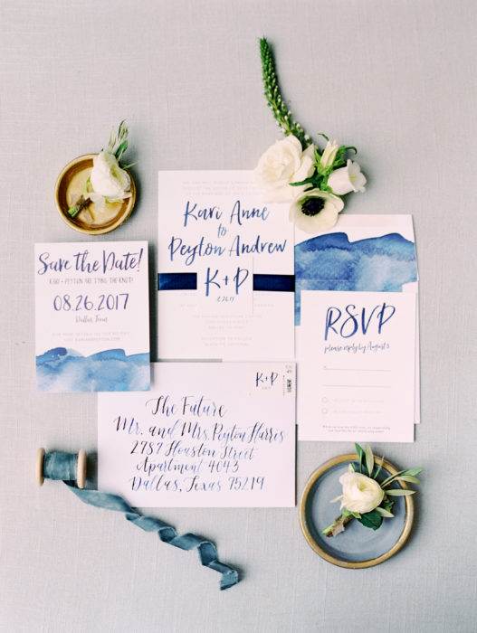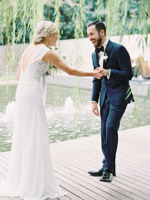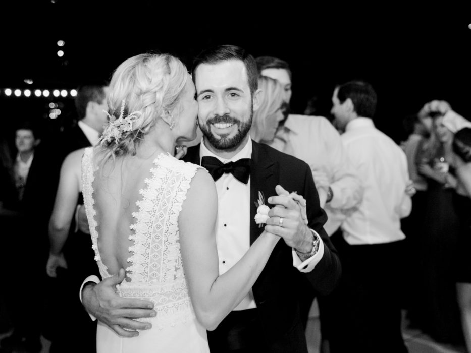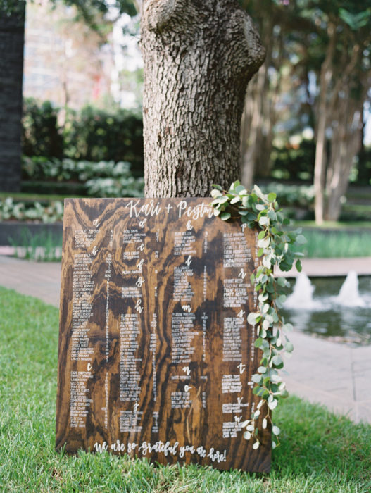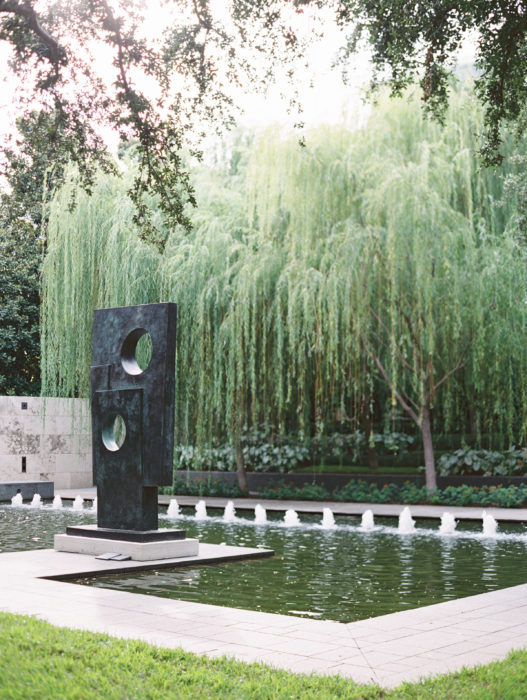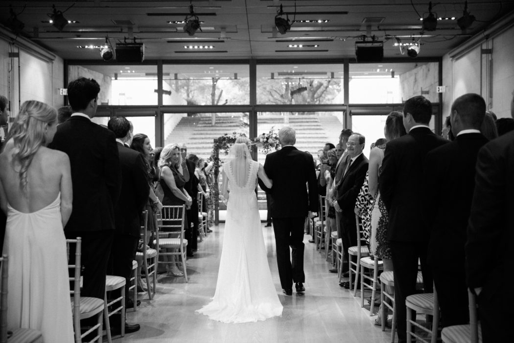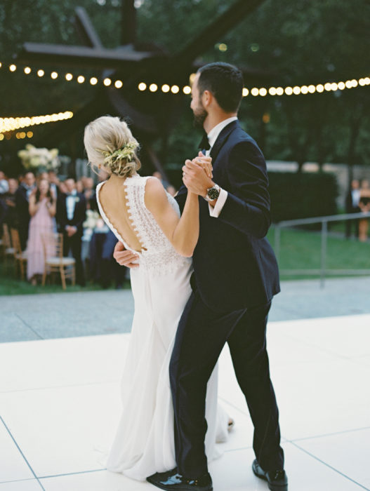 With dreams of having an outdoor wedding, the beautiful setting of the Nasher Sculpture Center was perfect for the couple. “I wanted the venue’s aesthetic to speak for itself, and I didn’t want to take away from its beauty,” Kari says. The vision for the venue was a timeless scheme with modern details. They kept the palette neutral with whites, grays, and elements of wood, metals, and marble. Groomsmen wore navy suits and bridesmaids wore light gray haltered gowns.