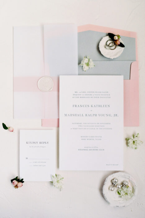 A love story that began in the halls of All Saints Episcopal School culminated with a spectacular September afternoon ceremony at Robert Carr Chapel in Fort Worth. Kathleen Baird and Marshall Young Jr., both Fort Worth natives, had been dating for seven years when he popped the question. Kathleen came prepared when Marshall, who is notorious for being unable to keep a secret, planned a conspicuous brunch date at the River Crest Country Club. “I knew he had a whole spiel planned, but he didn’t even make it through the first sentence before he dropped to his knee and asked me to marry him,” she says. Working closely with Melanie Tatum, who also planned Kathleen’s Debutante ball, the couple was able to bring together their vision of a wedding that incorporated both sides of the family. On September 7, 2019, the two were wed by the All Saints chaplain in the same chapel that Kathleen’s grandparents were married in 63 years prior.