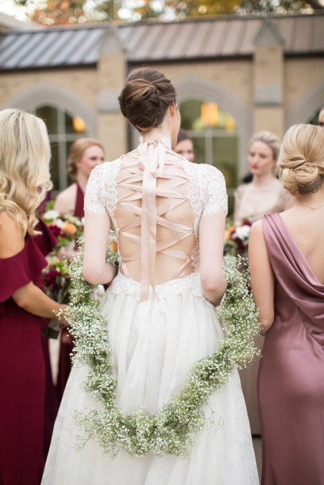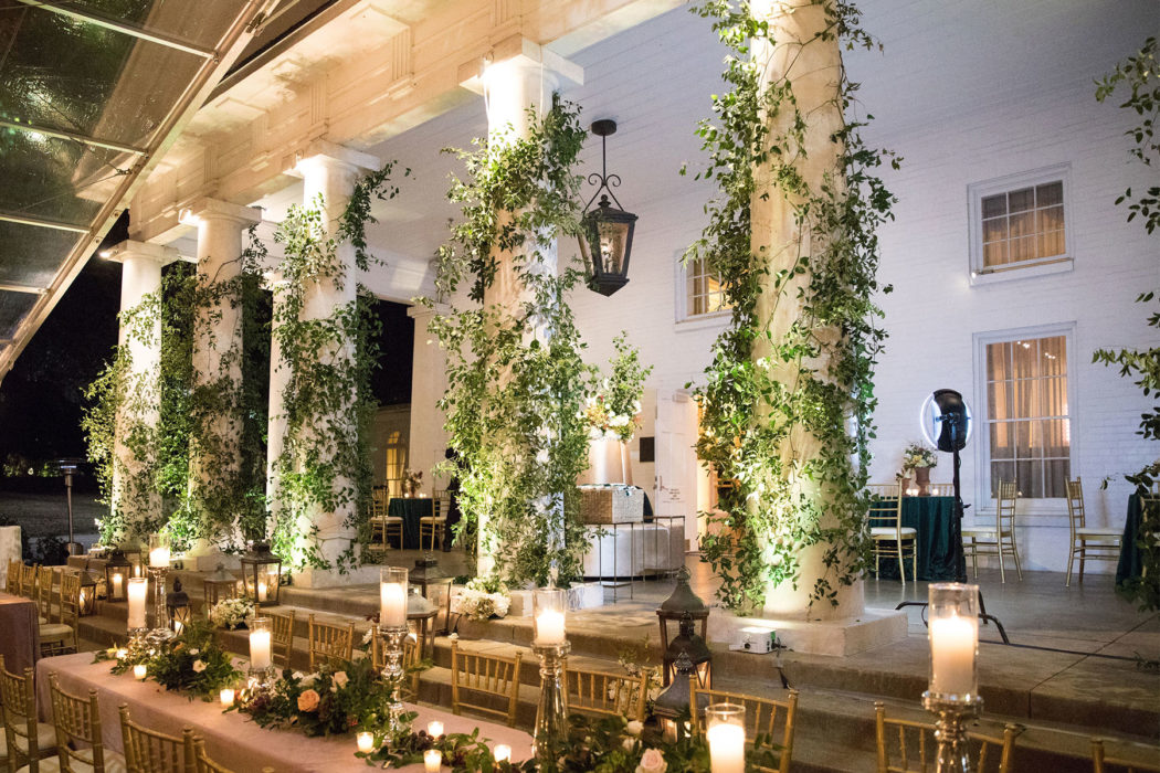 “When collaborating with Junior, I had the idea to add smilax to the columns of Arlington Hall,” explains planner Kirstin Rose of Kirstin Rose Events. “I thought it would be the perfect continuation of Katie’s vision. The greenery softened the otherwise grand and bold white columns.”