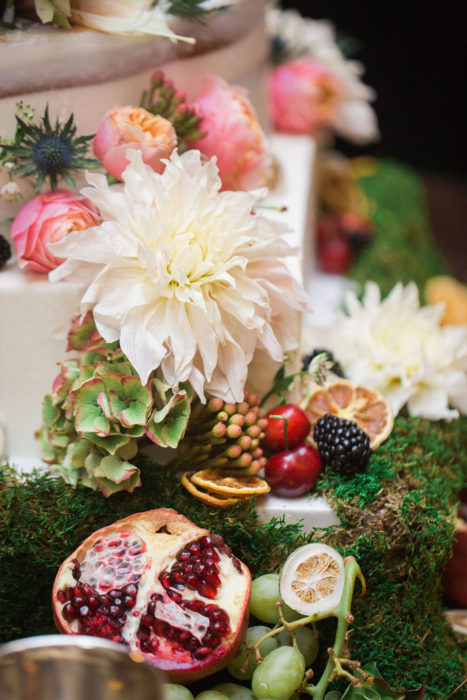 Katie wanted the chocolate and vanilla layered cake to look like a still-life painting, hence the artfully placed fruit and flowers.