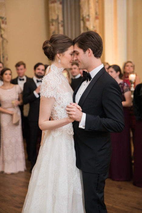 Will Decker and Katie Lemon’s relationship spanned almost five years and four cities before they became engaged in Paris. Will asked Katie to marry him in a little apartment on Rue Montorgueil before heading out to dinner. The romantic engagement was much like their wedding day—classic, sentimental, and personal, almost like it belonged in a painting. In fact, Katie looked to the Dutch masters to set the tone for their wedding day on November 17, 2018. Fruit adorned the layered cake, smilax vines wrapped around the columns at Arlington Hall, and the bride carried a boa made of baby’s breath. “We really wanted the whole evening to feel like this Old World, cozy wedding at home,” Katie says. “I told my florist that I wanted it to be very moody, and he definitely delivered.”