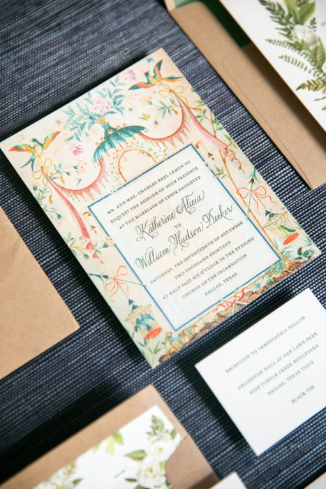 “I adapted the invitation from an antique chinoiserie panel that I had long ago fallen for, and it truly was a labor of love,” explains Katie. From there, the birds became the unintentional theme of the wedding. They were displayed on the website, save the dates, napkins, cups, and stickers for the welcome baskets. “They even made an appearance on our ‘just married’ sign of the getaway car,” she says.