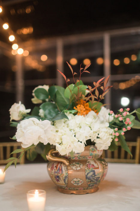 “Junior [at Garden Gate] has an incredible collection of vessels in his studio, and after having spoken with me and taking a look at my invitation, we picked out a variety of vases that incorporated those elements into the reception,” Katie says.