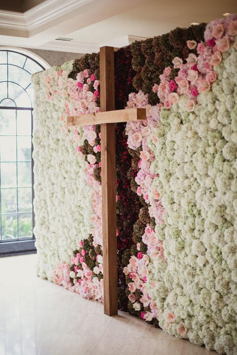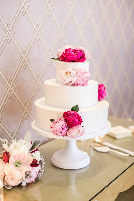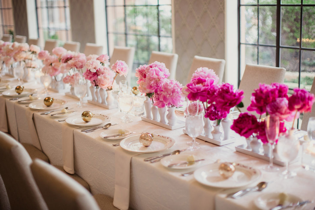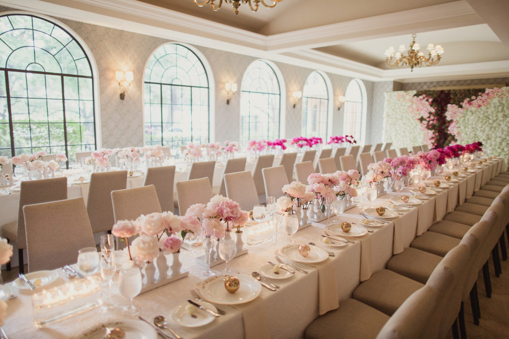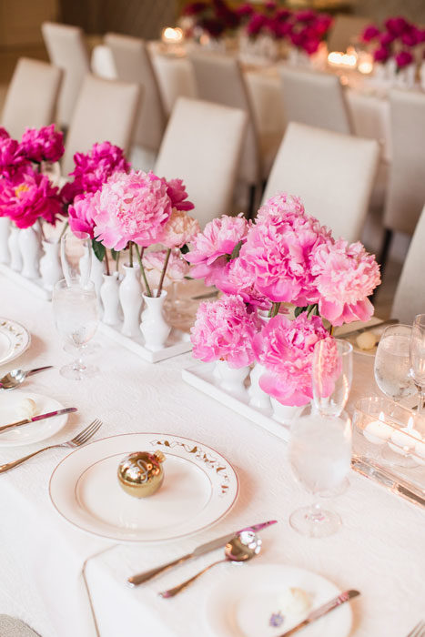 The decor was a complete surprise to Kayla, from the single-stem peony centerpieces that ran the length of the family-style tables to the elaborate flower wall that Nathan spent all night constructing. “I have a new favorite flower: I love peonies now!” Kayla laughs. “But if you had asked me before the wedding, I wouldn’t have known what that was.”
