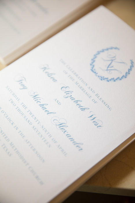 The color scheme for the day was simply white and light blue, complete with a macaron tower and French quotes on the program. While Troy is a Dallas native, Kelsea grew up in Atlanta, and so Southern touches were essential, down to the mini ham and cheese biscuit hors-d’oeuvres.