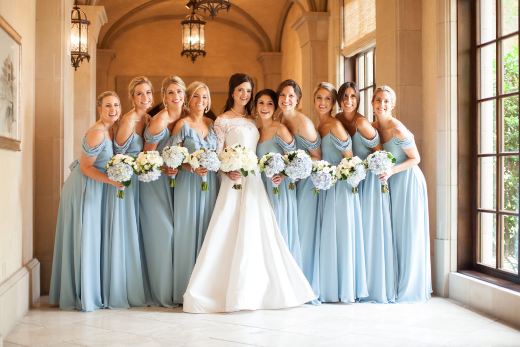 The couple wanted the attire to be elegant and play into the blue color scheme. The groomsmen wore navy tuxes, while the bridesmaids all wore the same light blue off-the-shoulder dress by Joanna August. “I wanted all bridesmaids dresses to be the same, as opposed to the recent trend of varying styles, to keep the look as classic as possible,” says Kelsea.