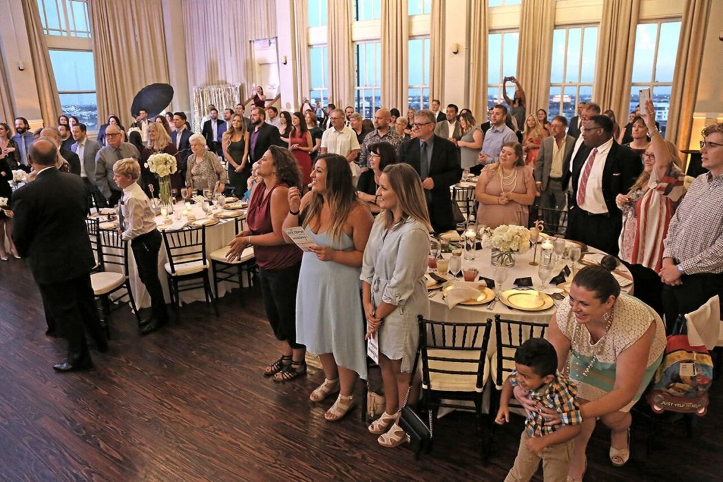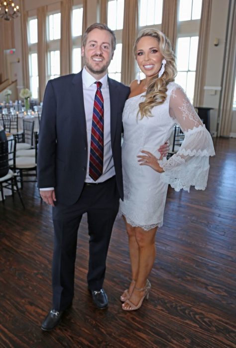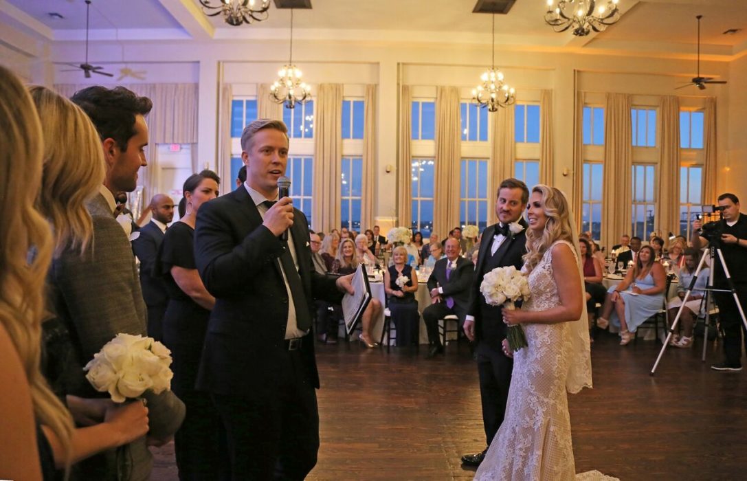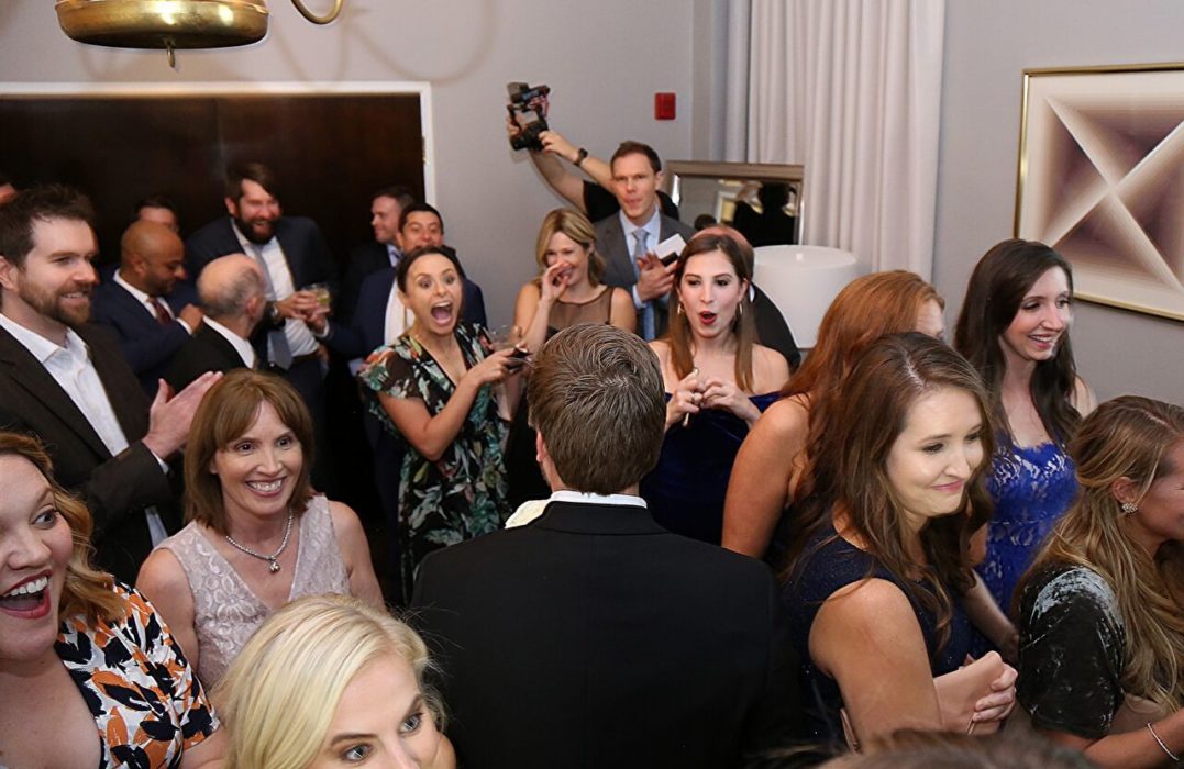 The wedding party was assembled, thanks to my mom lining everyone up and implementing a quickie crash course, since we didn’t have a rehearsal. Soon one of our officiants, who also owns Dallas Comedy House, was cued to head on stage and wrangle the crowd for dinner. She offered to lead everyone in a toast and exclaimed, “Cheers to Kimber and James, who finally selecting a wedding date. It’s October 5, 2018.”