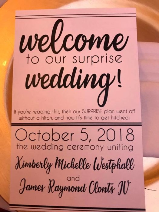 This is what our impromptu wedding guests read on October 5 as they were puzzling together the context clues of a surprise wedding. It unfolded in front of them hint by hint.
