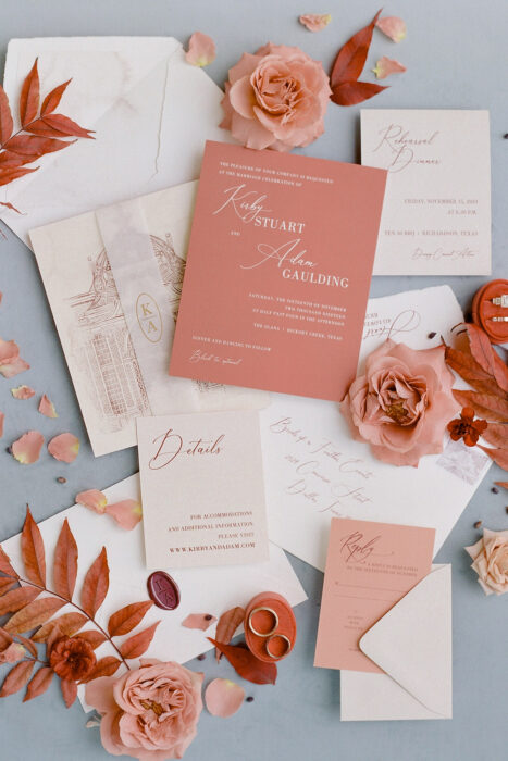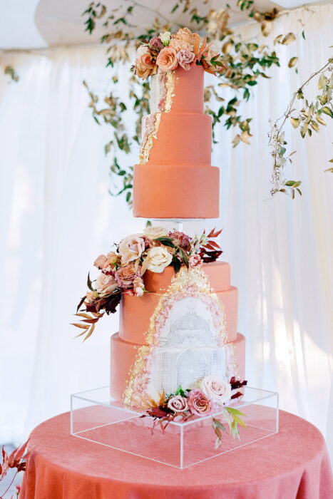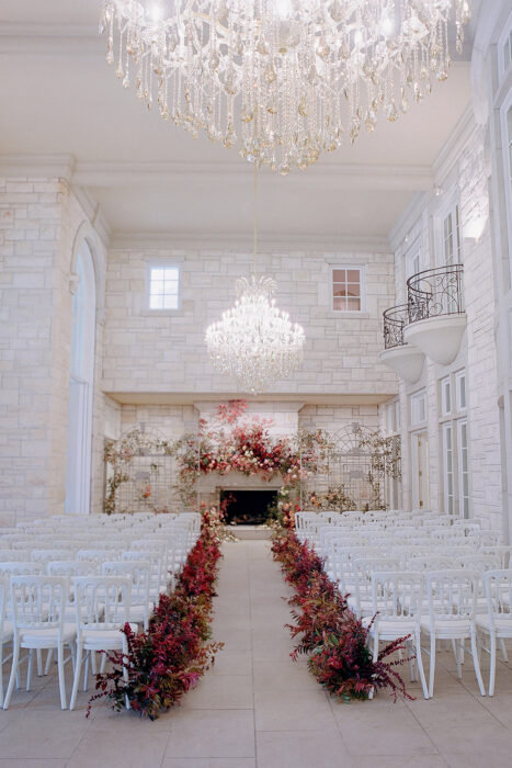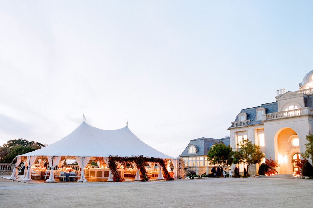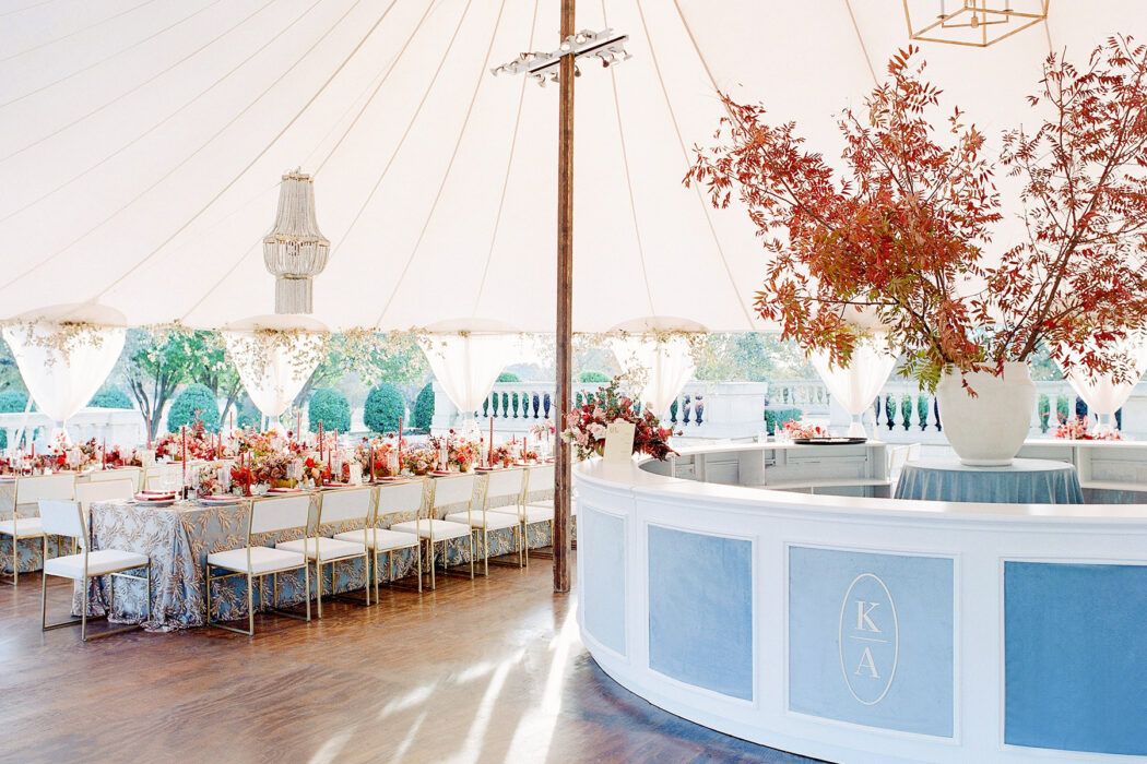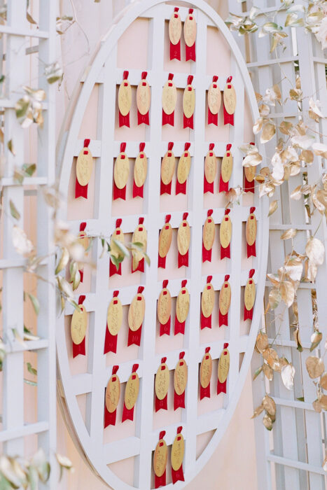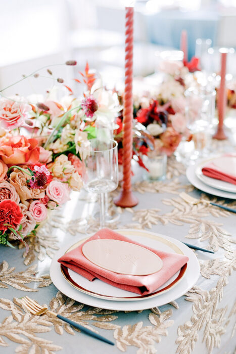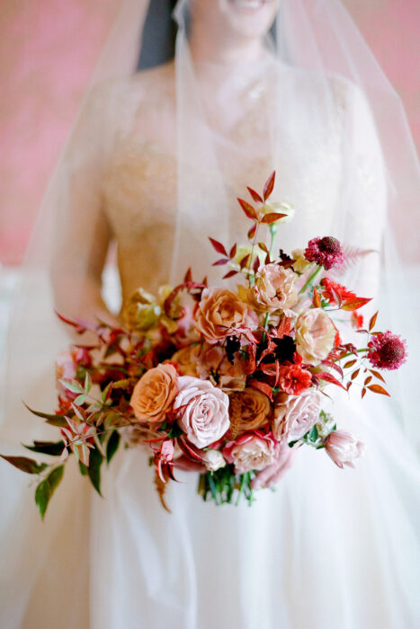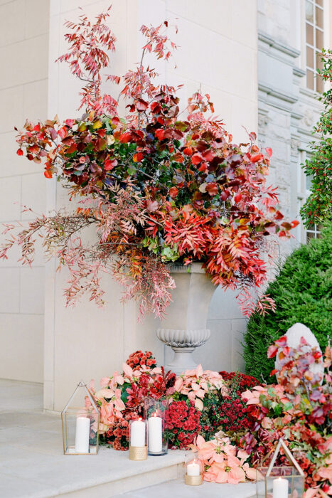 For her nuptials at the Olana, Kirby wanted a fall wedding that didn’t feel too, well, fall. “I didn’t want Barney purple and vintage orange,” she explains. So together with Maxine Owens of Max Owens Design and friend and wedding planner Wendy Kay of Birds of a Feather Events, she focused on crafting a scene that celebrated three of the bride’s great passions: Adam, disco, and fashion. “Kirby loves disco,” says Wendy. “So we created a ‘disco garden’ in the reception space. And Chanel’s runway had a lot of trellis work that year, so Kirby built a similar structure for the escort-card display herself.” Meanwhile, Maxine eased any remaining fears Kirby may have had about a fall-friendly palette with an abundance of jewel-toned blooms and gold-dipped smilax vines. Notes Maxine: “Autumn flowers really provide gorgeous tones and diversity, rich in color and a great mix of bloom varieties.”