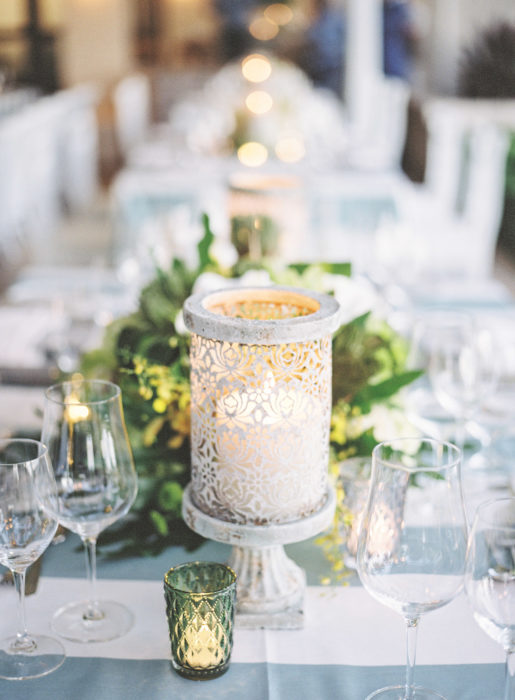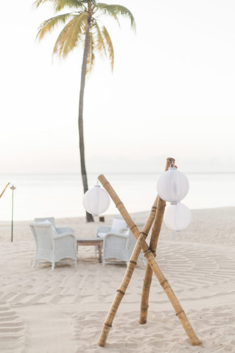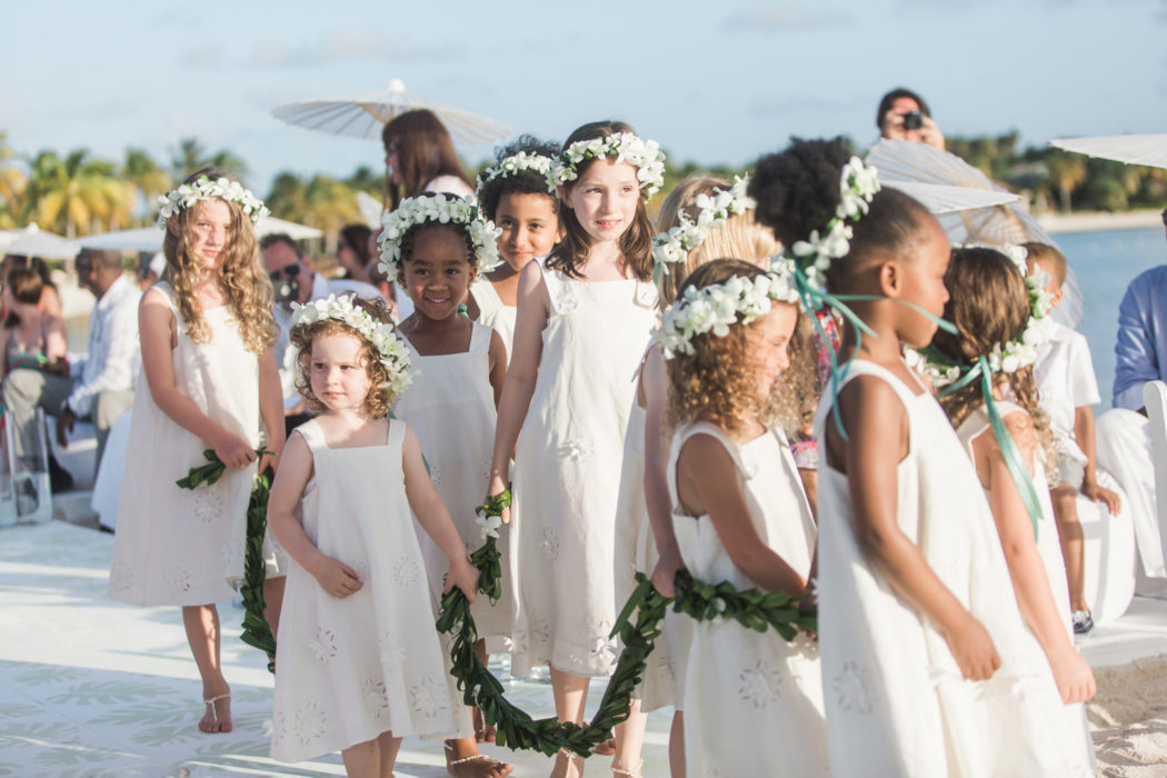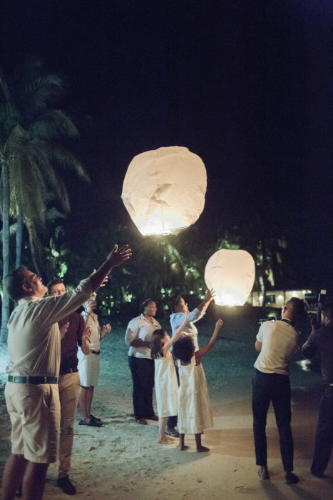 The wedding itself was held on the beach, on a platform that extended over the water and festooned with voluminous cascading phalaenopsis orchids and other greens. The flower girls wore floral garlands and white Stella McCartney dresses, and Jasmine wore a dress from the same fabric as her mom’s gown by Le Spose Di Giò of Italy. Afterward, guests strolled to the restaurant, decked out in a palette of white, yellow, peach, taupe, and aqua with festive paper lanterns overhead. Guests were given miniature flags to inscribe with messages to the couple and place in a sandcastle built for the occasion.