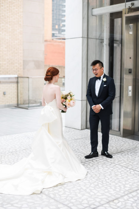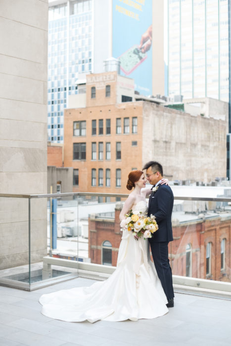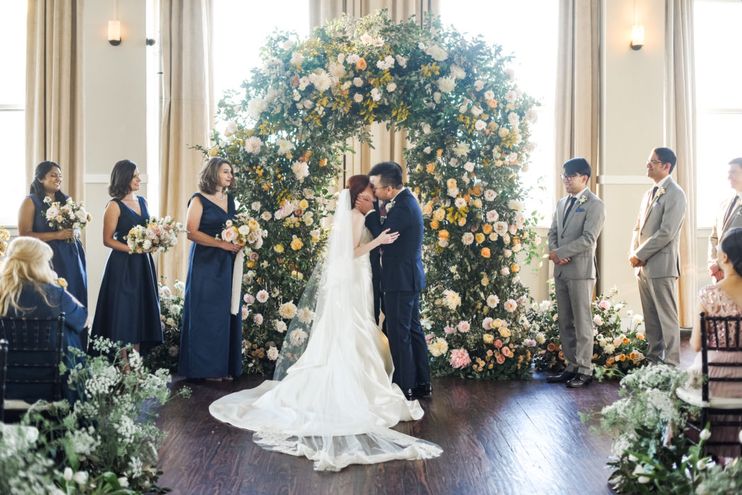 Having a last name at the end of the alphabet payed off for once for Kristen Zahnow and Hao Wu. The couple was often paired together for group assignments while attending SMU’s law school, which is where they met and fell in love. After a proposal at Austin’s Mayfield Park, they set the date for a September wedding. The couple wanted an outdoor affair, but instead of subjecting their guests to the Texas heat, they looked to Max Owens Design to transform The Room on Main into an airy, garden-inspired space. “The wedding reflected my love of nature and flowers,” Kristen, who holds a degree in botany, says