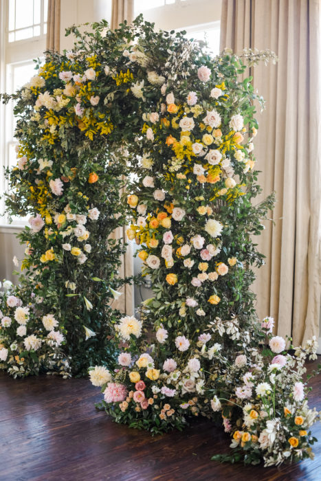 Max Owens, owner of Max Owens Design, chose yellow, white, and blush blooms to construct a striking arch.