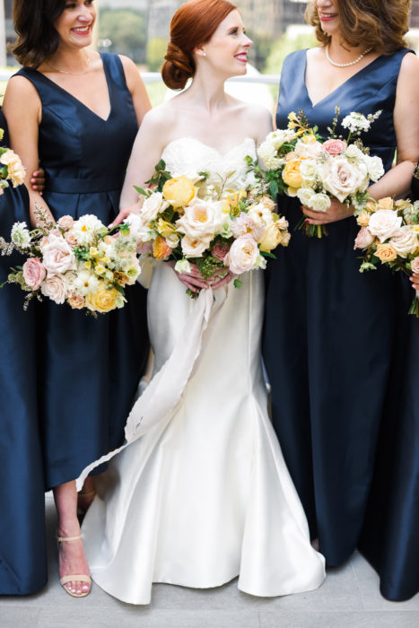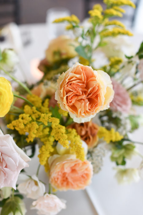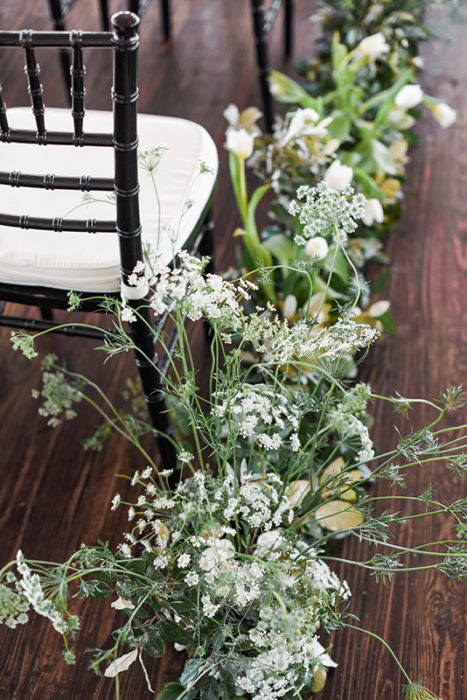 While Owens was ultimately tasked with working her wildflower magic, Kristen was the one who originally envisioned the organic blooms adorning the blank canvas of the space. In addition to the arch, garlands lined the aisle. “They really looked like they were blooming right there—coming up and out from the floors,” Kristen says.