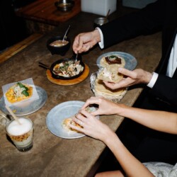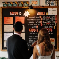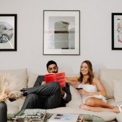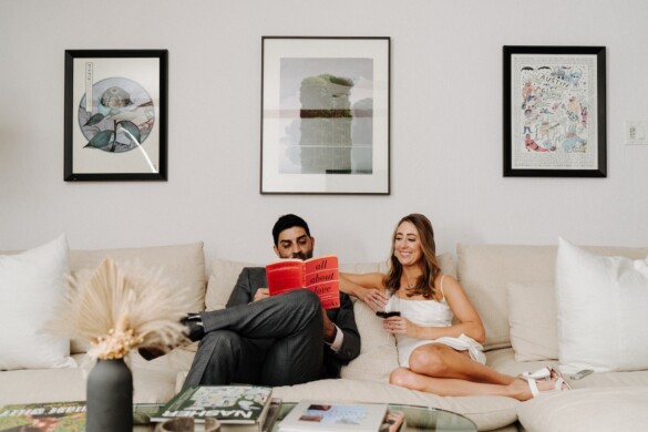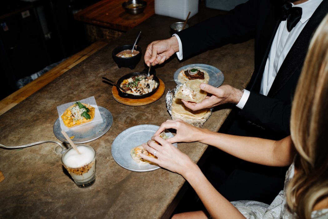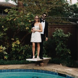 In planning every detail of their highly personalized November 2024 wedding—from their floral design to their engagement photos—Caitlin Clark and Christian Yazdanpanah intentionally zigged where others zag. “I was really waffling on even doing engagement photos,” says Caitlin, who is the online executive editor for D Magazine, adding in jest, “There aren’t any fields in Dallas I really connect with!” Luckily, her fiance had a vision. “I had a concept of elevating our daily routines into sophisticated candid shots,” says Christian, citing images of Old Hollywood icons as inspiration. The couple eschewed more typical settings in favor of their Lake Highlands neighborhood, capturing artful yet tongue-in-cheek portraits in their natural habitats—their favorite taco joint, the high school tennis courts, and their own backyard—while dressed to the nines. Says Christian: “We wanted our photos to remind us that even the most mundane days can feel glamorous when you spend them with someone you love.”