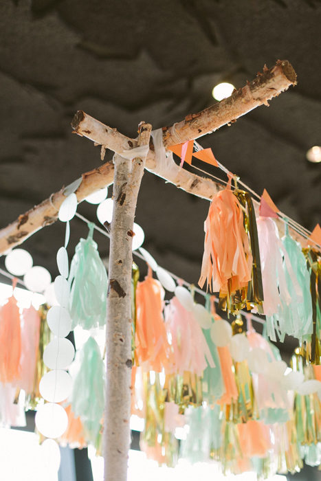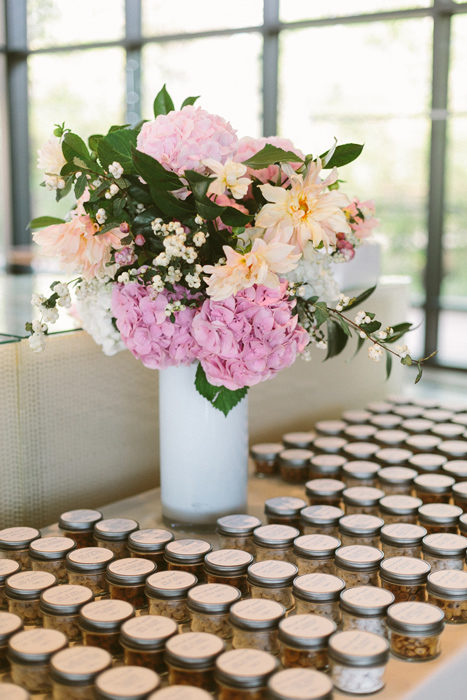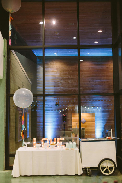 They chose the Audubon Center for its quiet setting and modern architecture. They worked with After Yes after falling for its pretty but restrained aesthetic. And Lauren says she is obsessed with the whimsical floral creations of Bows & Arrows. Together, the vendors delivered a sophisticated yet lighthearted setting for an evening of ceremony and celebration: a handmade chuppah with paper garlands and tassels; bouquets and table arrangements of lavender hydrangeas, peach dahlias, pink peonies, and ferns; and DIY ice-cream sundaes instead of cake.