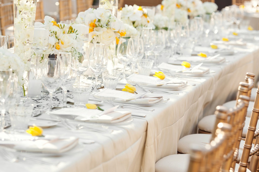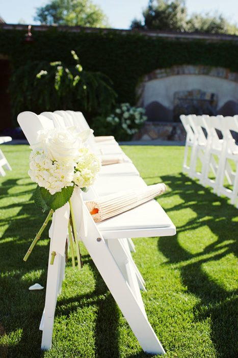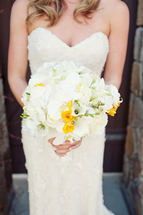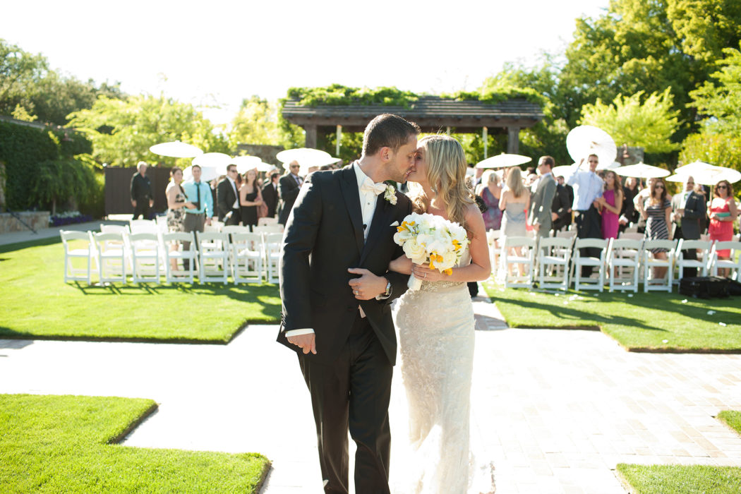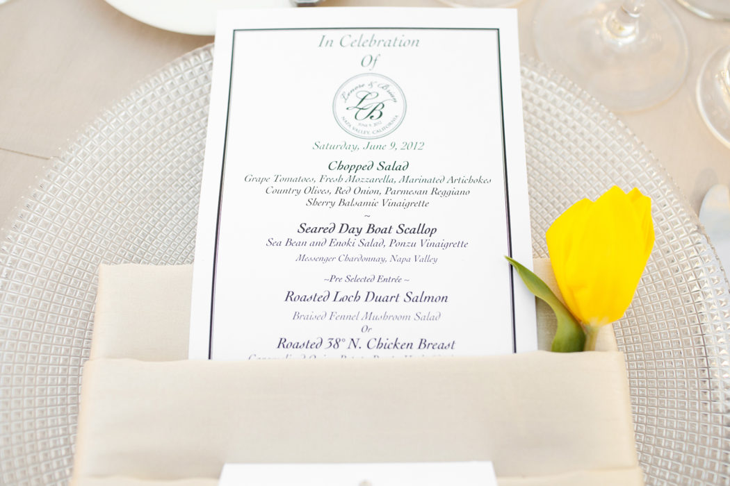 Don’t get a girl’s hair wet in the pool. Everybody knows that rule. Everybody except Brian Scates, who splashed Lenore Lang at a college pool party thinking she was someone else. Lucky for Brian, she decided to forgive him and the two were practically inseparable ever since. The Napa Valley venue was a simple choice for the two. “We had been to the Villagio before,” says Lenore. “We fell in love with it then and talked about getting married there the weekend we got engaged.” After the ceremony on the lawn, the couple and their 110 guests moved into the barrel room and were treated to a seated dinner that featured a seasonal menu and wines from the region. “It was a fairy tale,” says Lenore.