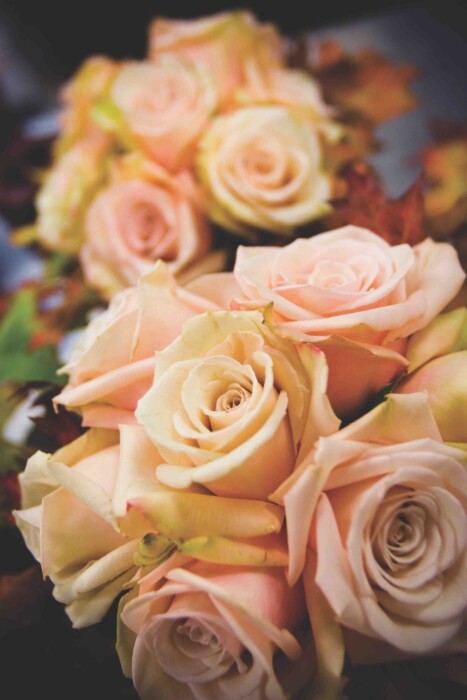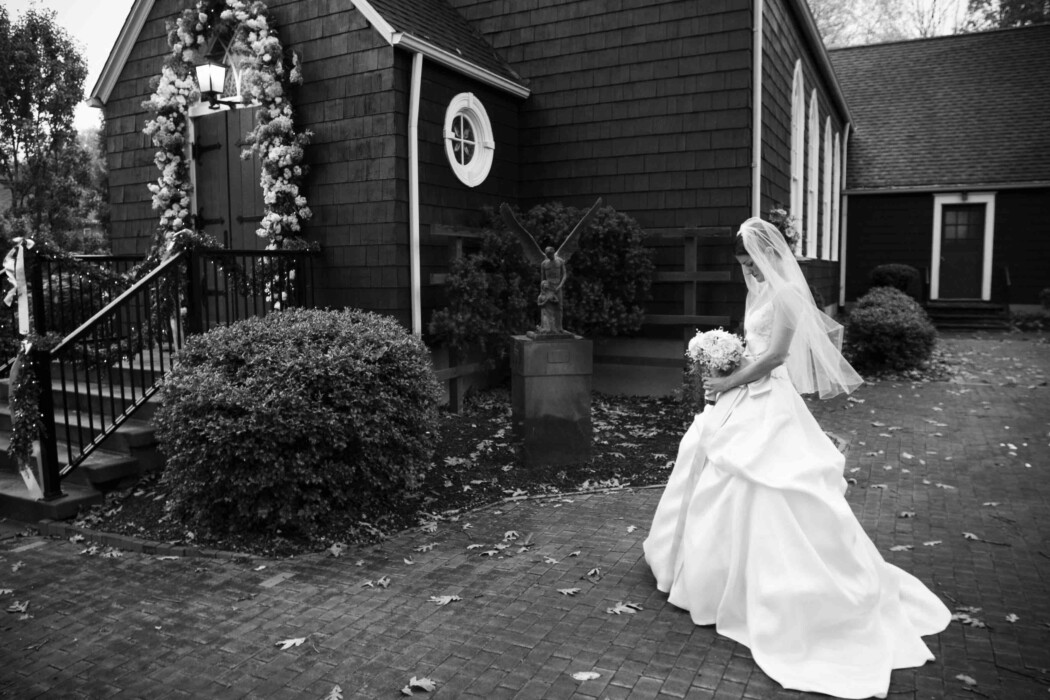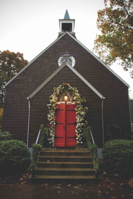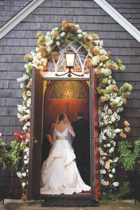And work it out he did. From the hand-painted canvas runner down the aisle of the picture-perfect chapel to the gold-velvet banquettes at the reception, from the custom-built chandeliers and the leaf-shaped chargers on the tables to the drifts of fallen leaves around the reception tent, Fiscus and company carried a natural, seasonal palette throughout the affair. “Lindsey and Conner’s wedding was a chance to do pretty for pretty’s sake,” he says. “And it felt like a throwback to another time.”