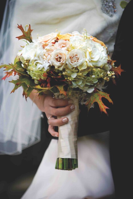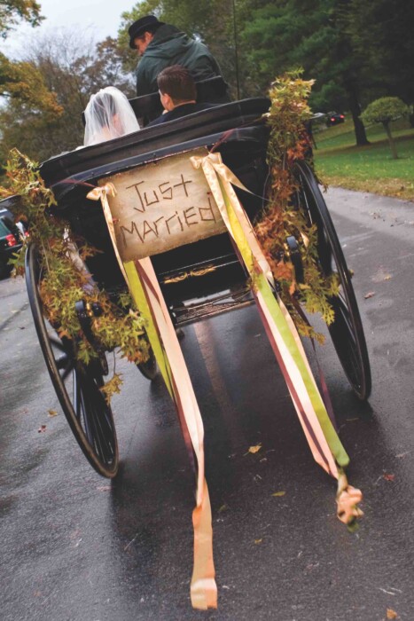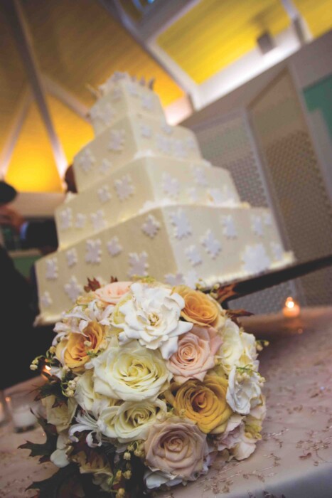 In keeping with the design, both the b ride’s and groom’s cakes were boxy, tiered confections decorated with sugar leaves. All of the tables were square, and rather than numbered, they were named after trees, “so no guest felt less important,” Lindsey says. Centerpieces were understated bunches of green apples, cabbage roses, camellias, hydrangeas, and maple leaves freshly gathered from TheE Greenbriar grounds, all arranged in rough-hewn containers.
