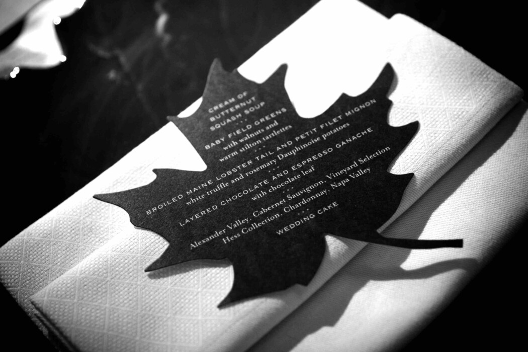 The bride specified squares, simply because she “loves the look,” and colors: apple green, chocolate brown, and ivory. A leaf motif was an obvious, easy choice, and the mountain location lent itself to an event that was elegant and intimate.