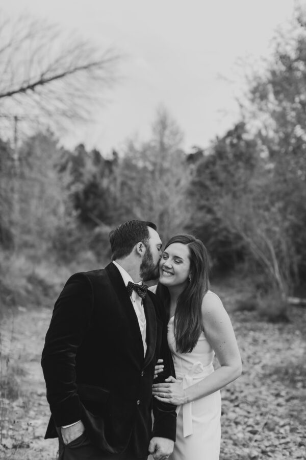 Knowing that, under new COVID-19 ordinances, their wedding couldn’t have more than 10 people in attendance, the couple moved on to Plan C. “That’s when the final plan started to take form,” Kelsey says. “We have some property in Bastrop and decided we would have the ceremony there. Two days before our ceremony, our officiant let us know he didn’t feel comfortable driving out to Bastrop, so my other brother stepped up and got ordained.”