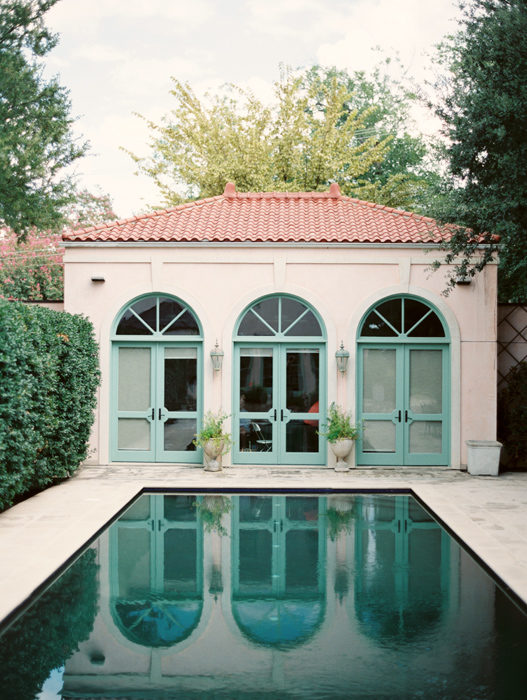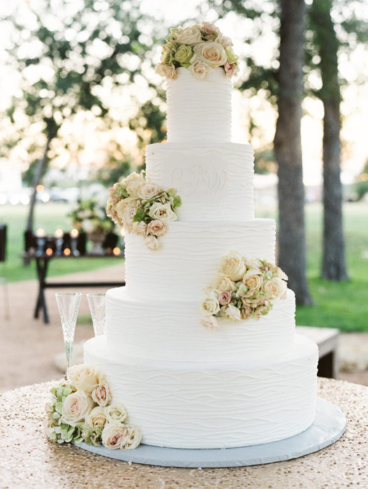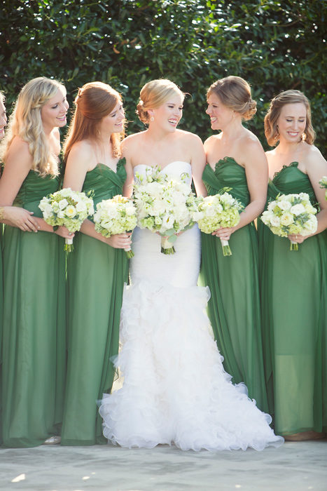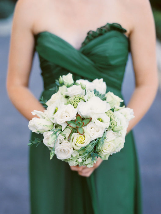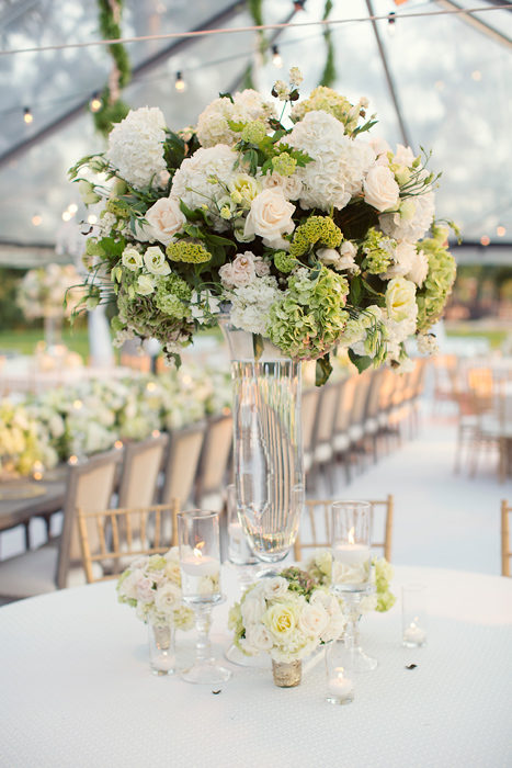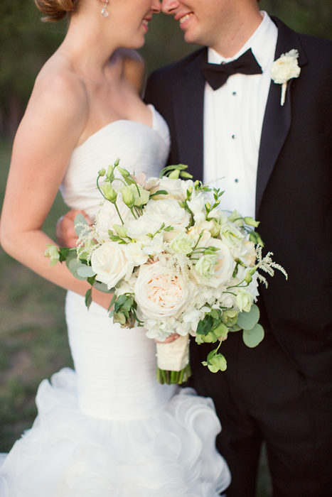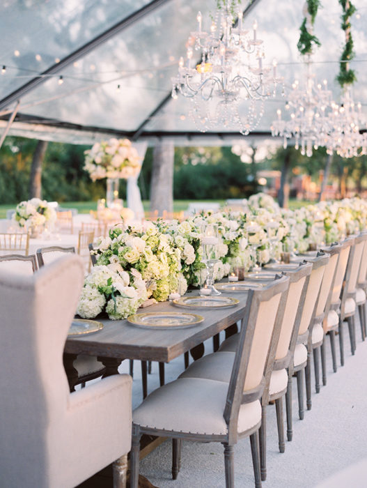 After touring Heart of the Ranch, it was an easy choice. Carson and Lucy Diaz-Flores of Bella Flora led the way for the logistics, design, and floral aspects of the wedding day and used the bride’s favorite hue—kelly green—as their starting point. “I give a lot of credit to them. I just gave them a few things that I wanted, and they ran with it,” she says. She met with the floral designers a few times, but the tented reception still took her breath away upon seeing it for the first time. She was stunned at the farm-style head table, complete with a 32-foot-long runner composed of jumbo hydrangea, fluttery garden roses, vendela roses, dahlias, and Lisianthus and accented with fresh greenery. She says it was one of her favorite parts of the decor.