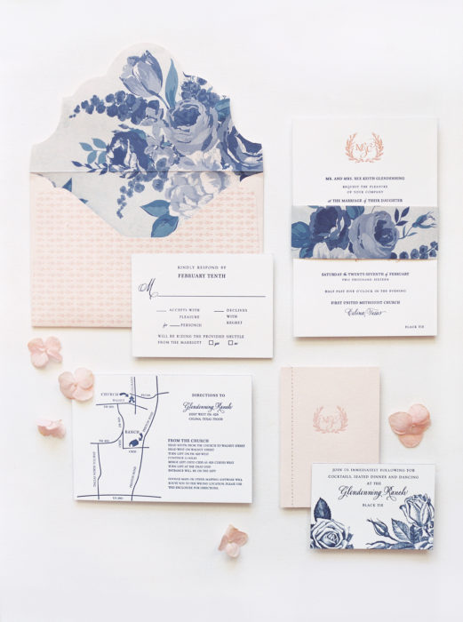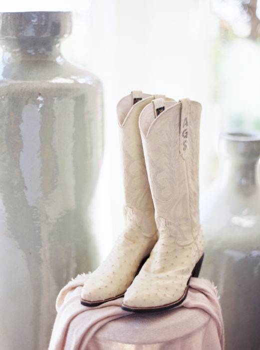 The wedding day unfolded with healthy doses of sentiment and surprise. The ceremony was held in the First United Methodist Church of Celina—a touching moment, considering it was the last wedding in the old church before moving to a new location. Then guests traveled to the Glendenning ranch, guided by charming signage on hay bales made by the bride’s father, Rex—a throwback to football days when the “hay man” would create signs before all the games. Once at the ranch, guests were entertained in a spacious tent accented with shades of rose gold, antique gold, and navy. The color palette added sleek, modern touches to the rustic charm. The bride’s favorite flourish was something she had no idea was coming, a fantastic rose wall behind the band. “On Saturday morning, I peeked at the tent, and it was like, ‘Whoa, hello floral!’” recalls Madison.