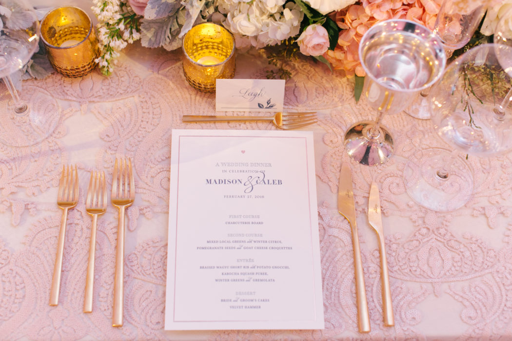Madison chose a column gown by Berta and added a dramatic train for the ceremony. The bride and groom chose a first look rather than first seeing each other among their 300 friends and family members. “I knew I would be anxious because all I’d want to do was see Caleb. I didn’t want to ruin the moment,” she says. “We went to the church and he was standing at the end of the aisle. Caleb is not a crier or emotional person, but he was more emotional than I was. It really hit him at that moment. Right when we saw each other, every nerve just went away.”