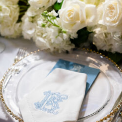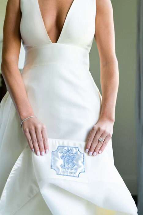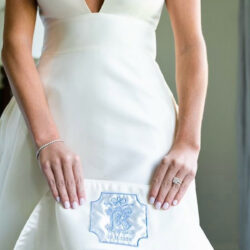 As any good Southern girl knows, there’s no such thing as too much embroidery—we slap our monograms on pillows, towels, handbags…you name it. The same holds true for your wedding day. (Did you know: When incorporating both your and your beloved’s initials, the correct term is duogram!) If there’s empty space, personalize it—with your family crest, wedding date, or something even more precious. “One of the most memorable items I’ve done was handkerchiefs for a bride and father of the bride bearing the signature of the bride’s mom, who had recently passed away,” recalls Becca Quisenberry of The Monogram Club (who kindly created our headline above). Quisenberry specializes in adding tasteful touches—“it should add value but not overtake it,” she advises—to anything from masks and cocktail napkins to bridal party PJs or the cuffs of a groom’s shirt. “Embroidery can transform an ordinary object into something extraordinary—an instant heirloom that will give deeper meaning to your celebration,” she says.