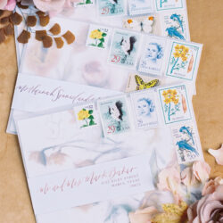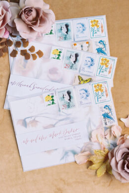 Custom stamps are the latest craze, but vintage postage (like that on Hannah Spaniel and Seth Zhanel’s invites) lends a nostalgic, romantic feel. Choose ones with meaning—your wedding flower or a favorite destination—for a personal touch.