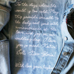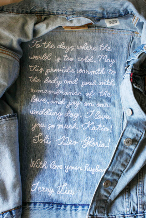 Before their October 11, 2019, wedding, Jerry Liu gifted his bride-to-be, Katia Kamra, with a gift he’d been working on in secret: a classic jean jacket with an embroidered love note hidden inside, purchased and personalized at Levi’s. “I took weeks to figure out what I wanted to tell her and had my sisters look over my words,” Jerry says. “I left the outside blank so my wife can add things as we build our life together.”