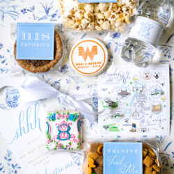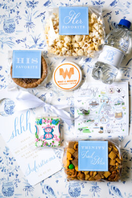 Greet out-of-town guests with a well-stocked welcome package. The Sederstroms’ kit had it all: a personalized privacy sign and illustrated map of places to visit around town (both by Paper Planet), plus a selection of his-and-hers favorite treats—including custom Velvet Crumb sugar cookies.