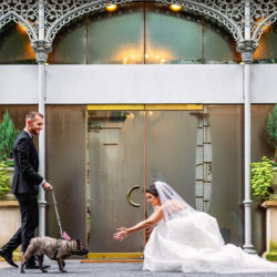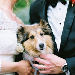 Falen Margolin and Elliott Milton’s dog, Philippe, played an important part in their October 14, 2018, wedding day—he was responsible for the exchange of letters between bride and groom. Here, best man Paul is seen helping Philippe fulfill his mission. “I hadn’t seen Philippe all day, and I was a ball of nerves as I’m sure you can imagine,” says the bride. “Having Philippe be a part of this day by making him the ‘delivery boy’ for our letters to one another was such a fun concept and really let me just kind of relax for a minute and have a sense of calm among the chaos.”