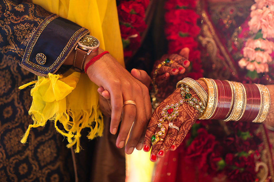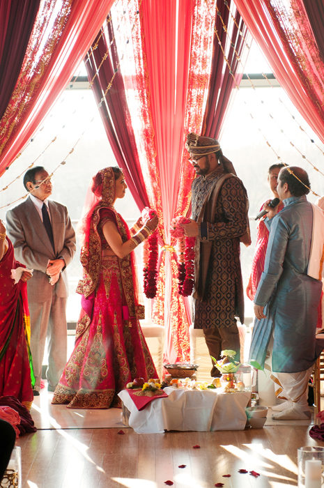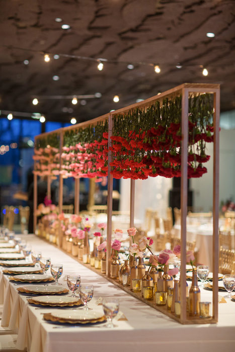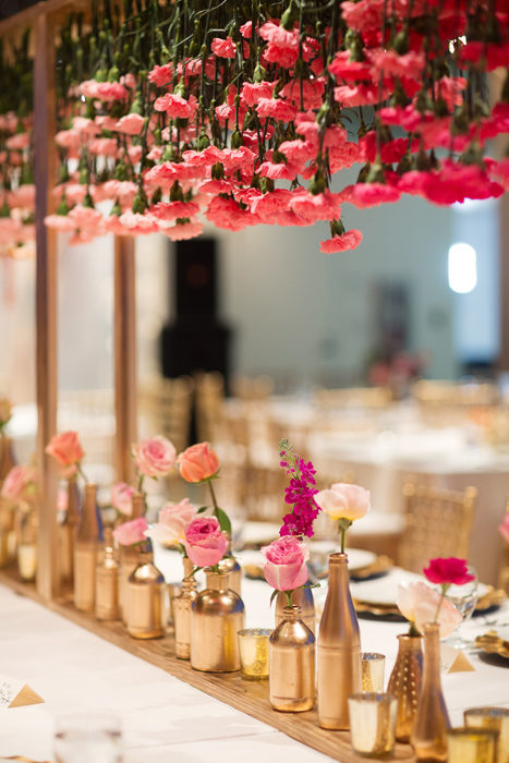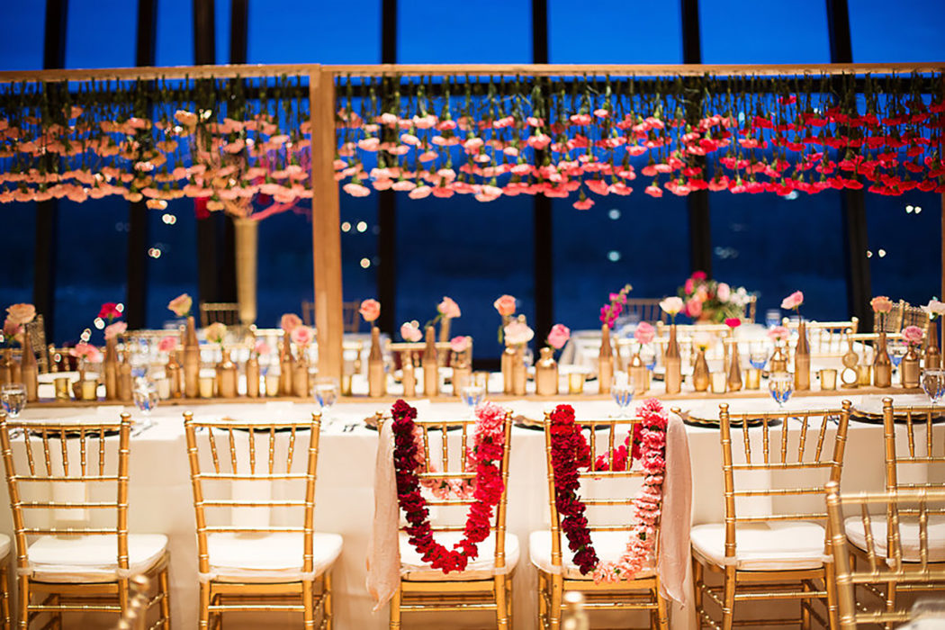 The bride blended American and Indian customs for her walk down the aisle. “In the Indian tradition, it’s usually an uncle who takes you to the area of the wedding ceremony,” she explains. So she made her march—uncle on her arm—donned in a lavish red Lehngha and ornate jewelry in gold, emeralds, and rubies. The reception was equally colorful, with Monica changing into a glittering gold gown perfect for dancing. And to the surprise of the newlyweds, Kushal’s sister orchestrated a flash mob to “Uptown Funk.”