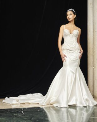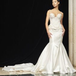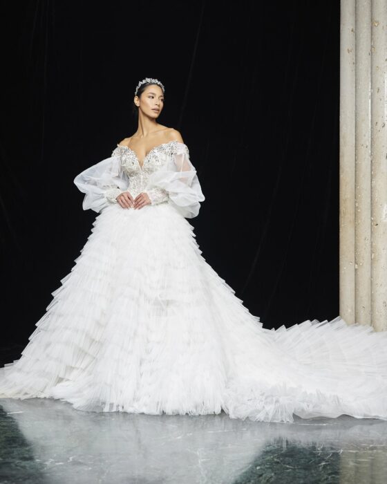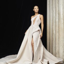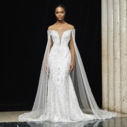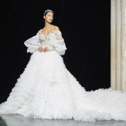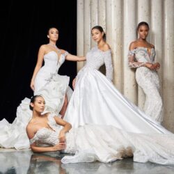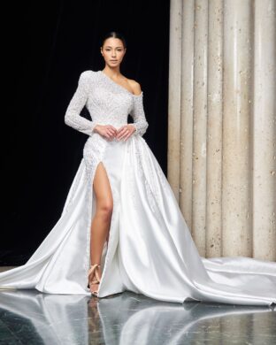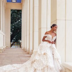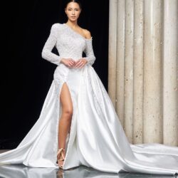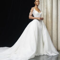 She does just that in her latest “Dream Collection.” Think heavy beading, full skirts, lace appliqués, and structured lines. From a blazer-style dress to two-in-one pieces for optimal reception partying, her latest collection is perfect for the strong woman who still wants to feel whimsical and light on her wedding day.