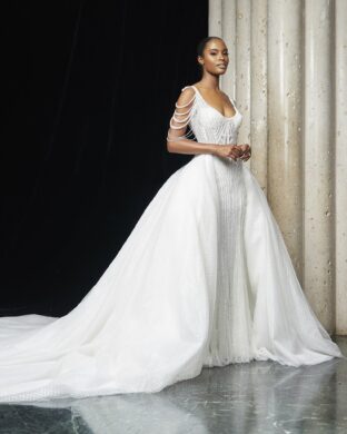 Azénabor cites many sources of inspiration for her designs, from places she’s travelled to dreams, in which fresh ideas for gowns often appear. “I will wake up from a dream and immediately sketch a design down before it disappears,” she says. She also has a strong image of what her ideal bride looks like and takes that into consideration when designing new collections.