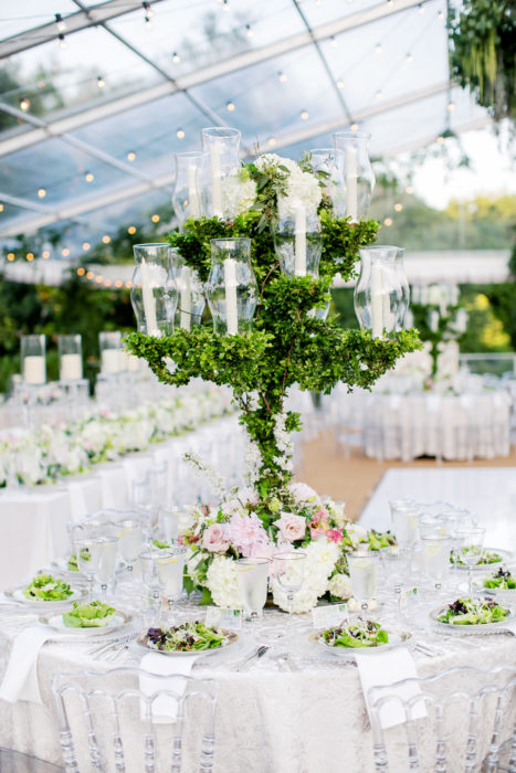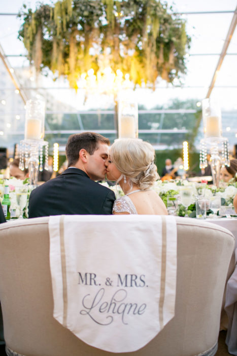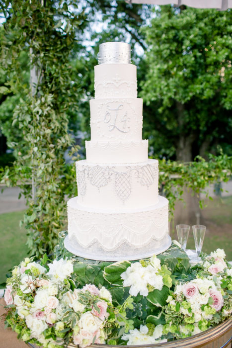 The wedding took advantage of four beautiful spaces at Arlington Hall: After cocktails on the veranda, the ceremony was held in the garden, followed by a reception in a tent on the side lawn, and an after-party inside. Olivia and Gregory loved the garden feel that the indoor/outdoor venue provided, as well as the variety of experiences. “There were constant surprises. The guests didn’t know what was coming next,” the bride says.