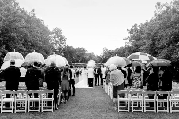 According to wedding planner Jess Wegner of Jess Wegner Events, if you’re considering tents for the rainy day then it’s important to give the tent company a fair warning so you have your top pick of styles. It’s also important to consider photography when constructing your rain plan. Dallas photographer Carter Rose of F8 Studio advises to ask about your photographer’s experience in making indoor lighting look as bright and luminous as natural light, which goes away during a rainstorm. Jess also gives the advice to have a stain removal kit—which includes Tide-to-Go pens, Shout wipes, an extra pair of shoes, and several large golf umbrellas—in case of rain-caused wedding attire spots.