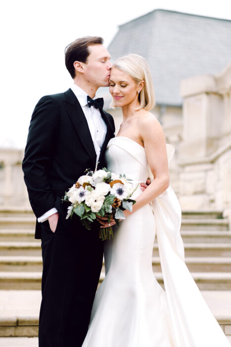 Our engagement in Colorado ended up inspiring our wedding theme. Since my fiancé, John, got down on one knee in the brisk chill of January, I thought, what could be more fitting than a winter wonderland celebration? I envisioned flocked pine trees, white rose bouquets accented with greenery and pinecones, fluffy fur shawls, and wintry accents at every corner. It would be an ode to my new last name—White—and our romantic engagement in the mountains.
