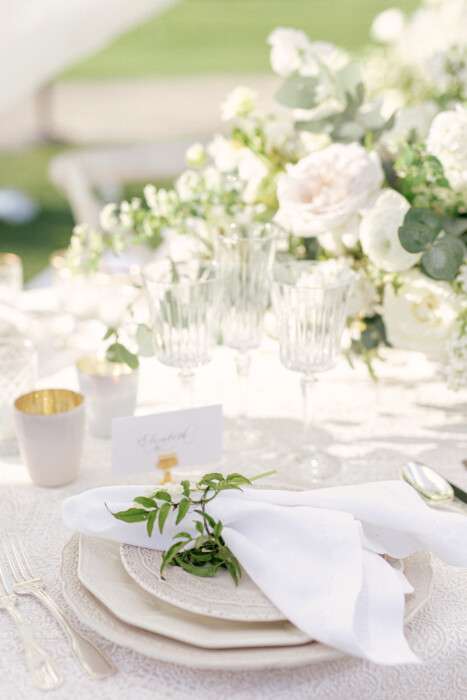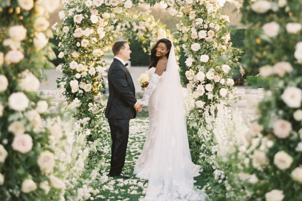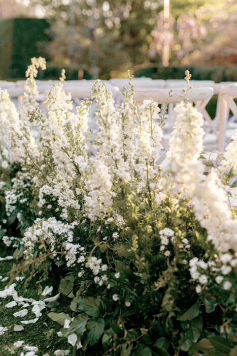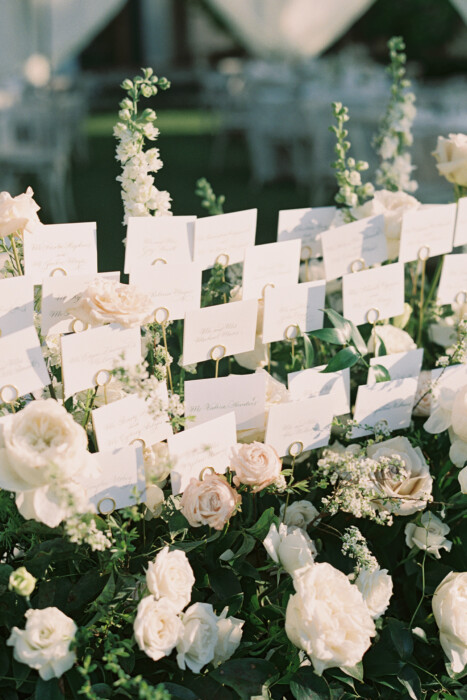 The verdant green grass of the Arboretum sets the stage for three dramatic arches covered in white roses. “When my dad and I turned the corner, I thought I was going to fall to my knees,” says Chanel. “It’s very rare that something meets my expectations and even rarer that something exceeds them.”