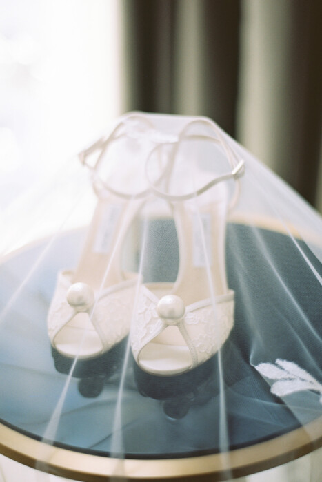 Ivory lace Jimmy Choo “Sacora 45” sandals paired beautifully with Chanel’s custom veil and dress by family friend Nha Khanh. “Ever since I was a kid, I knew if I ever got married, she would make my gown,” says Chanel. “She’s so insanely talented.”